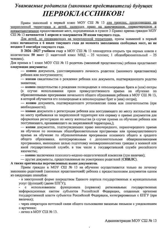 В 2025 -2026 учебном году в МОУ СШ № 13 планируется открыть два первых класса с количеством 50 мест (1 кадетский класс МВД – 25 человек; 1 общеобразовательный – 25 человек). Более подробную информацию смотреть здесь.